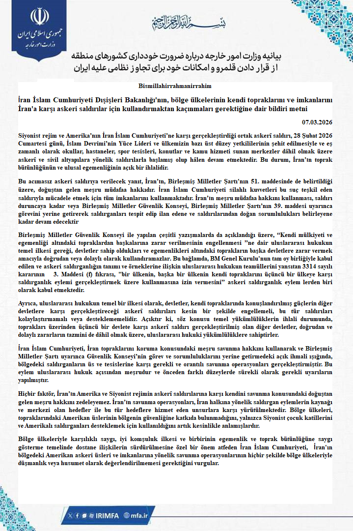 İran İslam Cumhuriyeti Dışişleri Bakanlığının bölge ülkelerinin kendi topraklarını ve imkanlarını İrana karşı askeri saldırılar için kullandırmaktan kaçınmaları gerektiğine dair bildiri metni